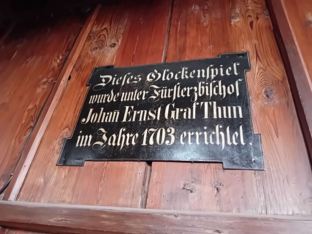 Ende des 17. Jahrhunderts wurde der Turm des Glockenspiels von Erzbischof Thun auf dem Gebäude der „neuen“ Residenz erbaut. Anlass dafür waren vergünstigte Glocken aus Antwerpen, welche dem Erzbischof vom Glockengießer Melchior de Haze angeboten wurden. Über lange Transportwege gelangten die 35 Glocken schlussendlich 1695 nach Salzburg. Nach der Fertigstellung des vollständig aus Holz gebauten Turms im Jahr 1702 wurde die Mechanik verbaut. Mithilfe eines Seilzugs und vielen Zahnrädern wird eine Messingwalze mit etwa 2,5 Meter Durchmesser in Bewegung gesetzt. In dieser Walze stecken Metallstifte, die je nach Anordnung, beim Drehen bestimmte Glocken auslösen. Auf diese Weise entstehen verschiedenste Melodien – bis zu 110 Lieder sind möglich. Seither erklingen die Glocken täglich um 7, 11 und 18 Uhr über der Stadt Salzburg.