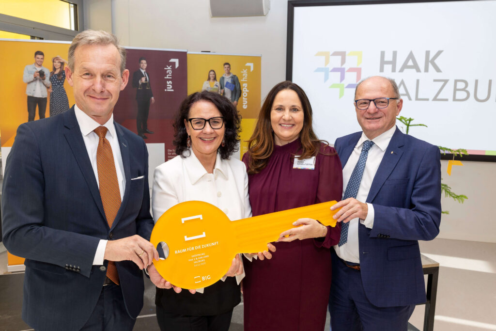 Schlüsselübergabe: v.l.n.r.: BIG Geschäftsführer Gerald Beck, Landesrätin Daniela Gutschi, Schuldirektorin Daniela Huber-Krimpelstätter und Salzburger Bildungsdirektor Rudolf Mair