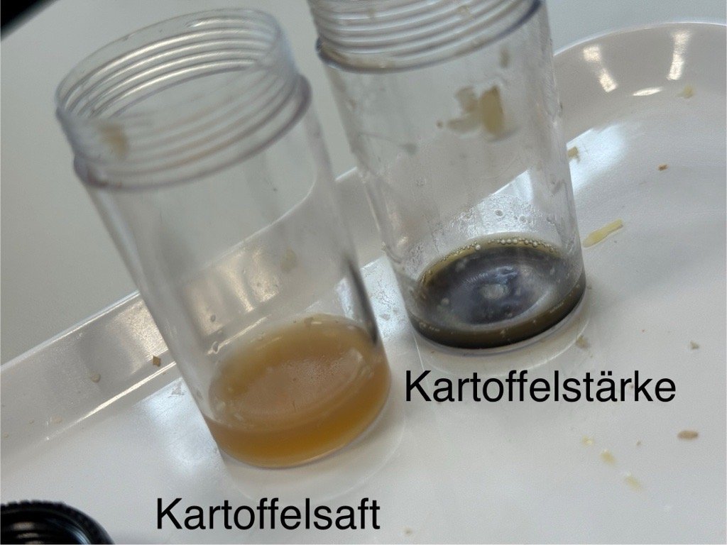 Dann kam der spannende Moment. Mit der Lugolschen Lösung (Jod-Kaliumiodid) haben wir beide Behälter getestet. Die Flüssigkeit hat sich gar nicht verfärbt, was bedeutet, dass sich darin keine Stärke befindet. Die weiße Masse, die sich abgesetzt hatte, wurde jedoch sofort dunkelblau-schwarz, was bedeutet, dass sich darin Stärke befindet. Was wir dadurch herausgefunden haben, ist, dass die Stärke nicht im Kartoffelwasser, sondern in der festen Substanz steckt. Ein einfacher, aber ziemlich cooler Nachweis!