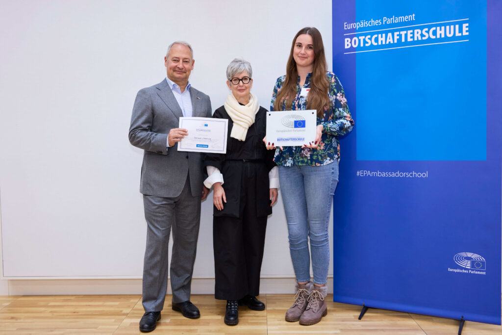 Ina und Jennifer aus der 3BK wurden im Rahmen des Programms „Botschafterschulen des Europäischen Parlaments“ von Frau Prof. Dax zu „Juniorbotschafterinnen“ nominiert. Die beiden engagierten Schülerinnen werden in diesem Schuljahr eine aktive Rolle auf dem Weg zur angestrebten Zertifizierung unserer Schule als „Botschafterschule des Europäischen Parlaments“ übernehmen.