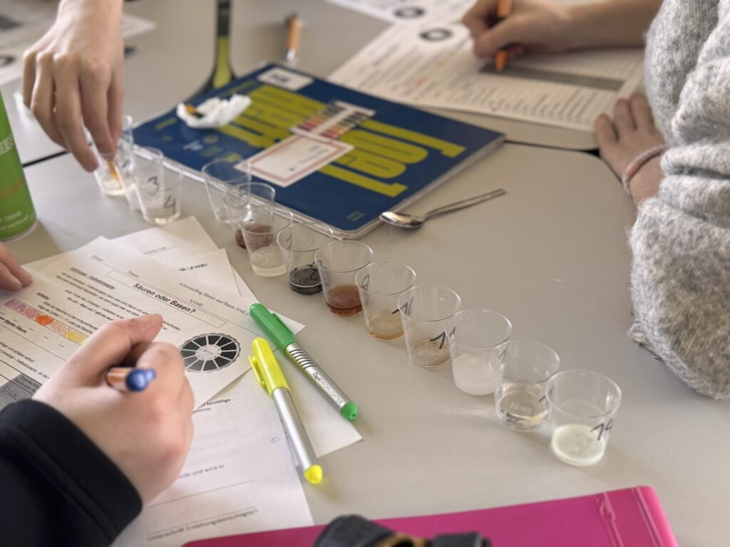 Heute wurden unterschiedliche Säuren und Basen durch Universalindikatorpapier kategorisiert. Bei diesem Arbeitsauftrag geht es zuerst um die Einschätzung der Gruppe: Wie sauer bzw. basisch wird die Probe sein? Als Abschluss unseres Themas wurde also noch einmal experimentiert.
