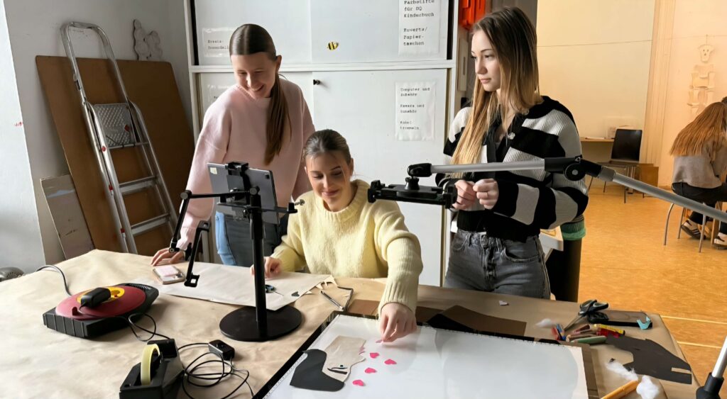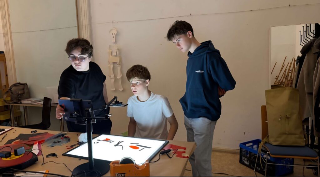 Auseinandersetzung mit dem Thema. Die Kleingruppen erstellten kleine Stop‑Motion‑Filme. Scherenschnitte spielten die Hauptrolle. Papier wurde geschnippelt, Figuren wurden bewegt, Ideen sprudelten. Und ganz nebenbei lernten die Jugendlichen viel über sich selbst und über die Menschen, mit denen sie täglich zusammenarbeiten. Wer denkt besonders fantasievoll? Wer hat ein Auge fürs Detail? Und wer sorgt dafür, dass am Ende alles zusammenpasst?